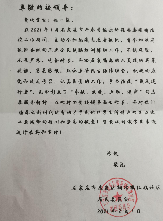 疫情期间,来自石家庄市鹿泉区2020级计算机科学与技术1班的赵一荻同学主动到铜冶镇红旗社区参与志愿服务活动,参加政府组织安排的三次全民核酸检测辅助工作,不惧风险,不畏严寒,吃苦耐劳,受到了当地政府和群众的一致好评。来自贵州省遵义市2020级网络工程1班刘秀兰同学主动参与到居委会组织的志愿者服务活动中,积极配合社区工作人员做好进出人员体温测量和登记,防疫知识宣传等工作。表现突出,获得八一社区“优秀志愿者”称号。石家庄市晋州市槐树镇龙泉固村2020级计算机应用技术1班的刘金萌同学寒假期间积极参加龙泉固村志愿者服务队,协助村委会工作人员做好全员核酸检测辅助工作,做好防控卡点值守、外来人员登记排查等工作。她不怕苦不怕累,坚守岗位,获得了大家的一致好评。