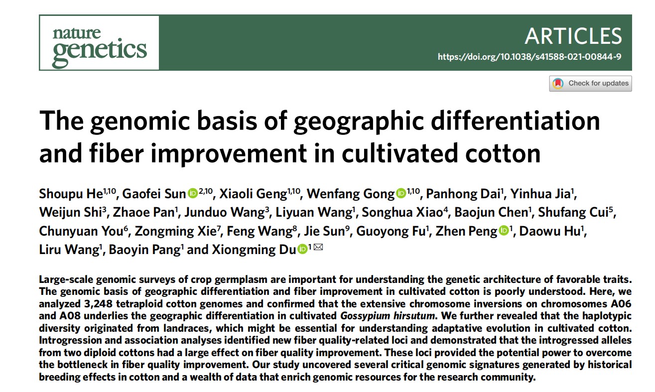 近日,由公司3044永利集团有限公司与中国农业科公司棉花研究所杜雄明课题组联合完成的研究成果《栽培陆地棉地理分化和纤维品质改良的基因组学基础》在世界顶级学术期刊《自然·遗传学(Nature Genetics)》在线发表,标志着公司高水平科研成果又取得一项新突破。中科院棉花研究所何守朴副研究员为该论文第一作者,杜雄明研究员为论文通讯作者;公司为该成果的第二完成单位,3044永利集团有限公司孙高飞副教授为论文的共同第一作者。