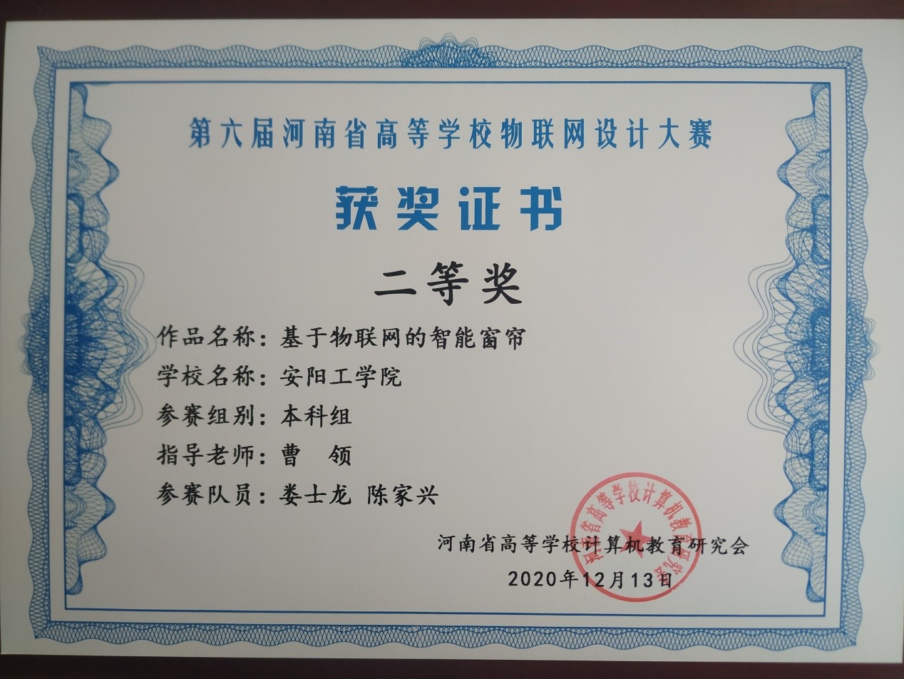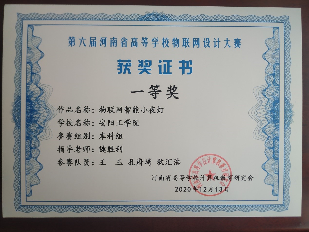 由河南省高等公司计算机教育研究会主办的第六届河南省高等公司物联网设计大赛于上周落下帷幕。此次大赛吸引了包括郑州大学、郑州轻工业大学、河南理工大学在内的二十多所高校参赛。经过线上作品展示与答辩,公司3044永利集团有限公司物联网工程专业王玉等同学设计的“物联网智能小夜灯”获一等奖,娄士龙等同学设计的“物联网智能窗帘”获二等奖。