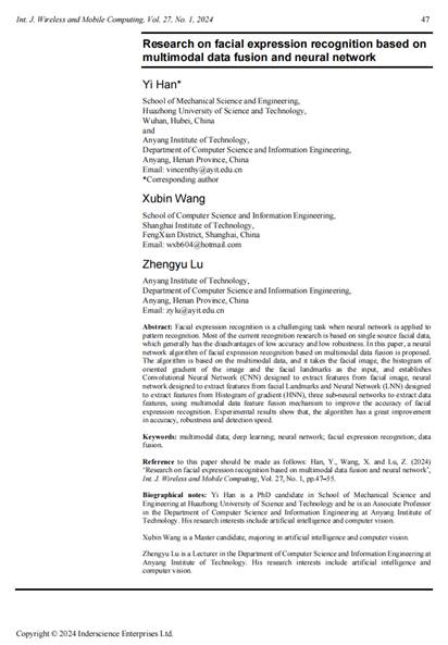 2024年7月公司韩毅老师在EI期刊International Journal of Wireless and Mobile Computing发表了题为《Research on facial expression recognition based on multimodal data fusion and neural network》文章,该研究针对目前多数识别面部表情研究是基于单源面部数据进行的,普遍存在准确率较低、鲁棒性不高的缺点。本研究提出了一种基于多源异构数据融合的神经网络面部表情识别算法,该算法以多源异构数据为基础,将面部图像、图像的方向梯度直方图以及面部特征点三项异构数据为输入,分别建立CNN,LNN,HNN三个子神经网络提取数据特征,采用异构数据特征融合机制,提了高面部表情识别的精度。实验表明,得益于异构数据间的互补性,该算法相对于传统人脸表情识别算法在精度、鲁棒性以及检测速度上都有较大的提升,特别是在人脸被部分遮挡、光照、头部姿势变换情况下,该算法也显示出较高置信度。